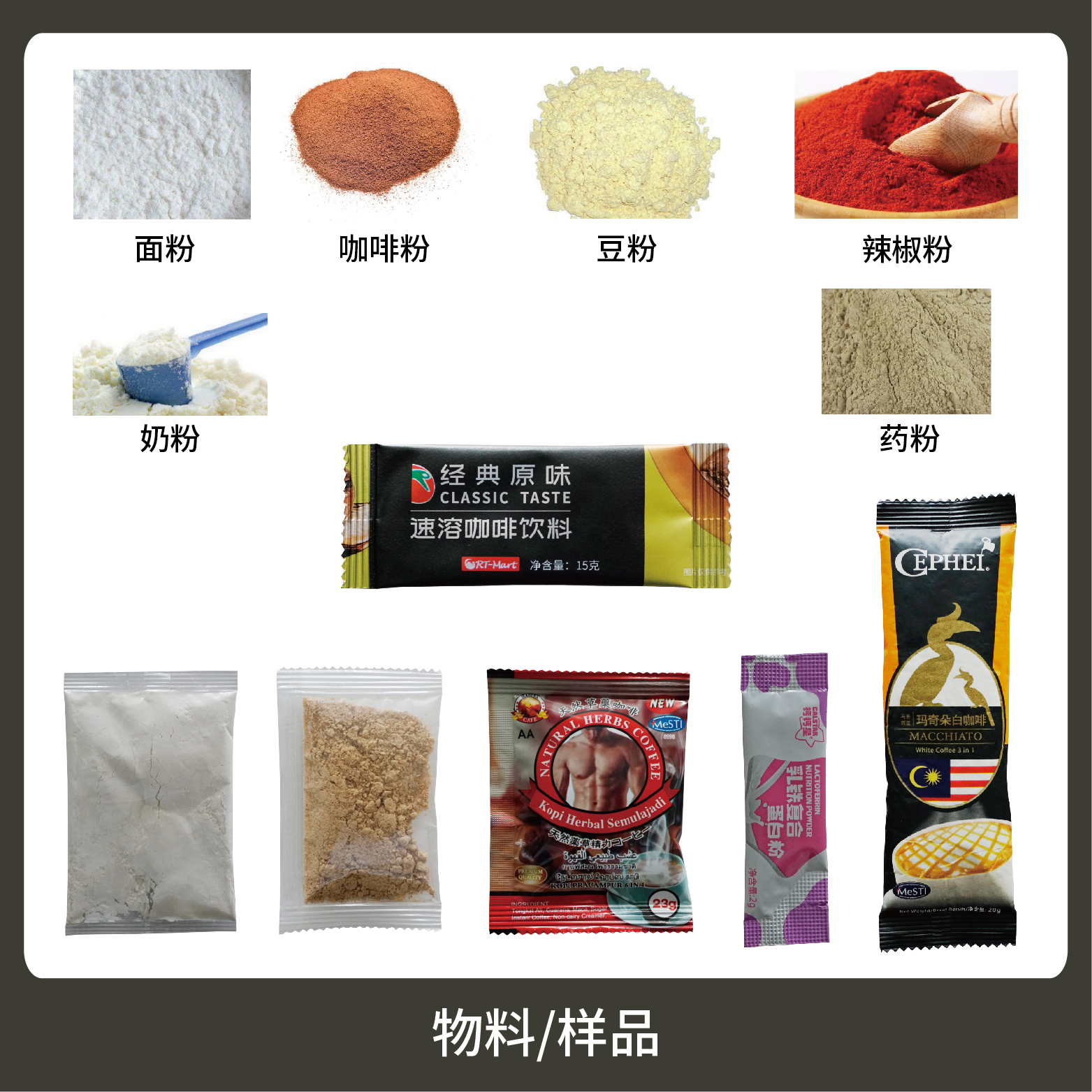 適用于食品、醫(yī)藥、化工、化妝品行業(yè)中粉末物品的計(jì)量包裝,如:豆?jié){、奶粉、咖啡粉等。